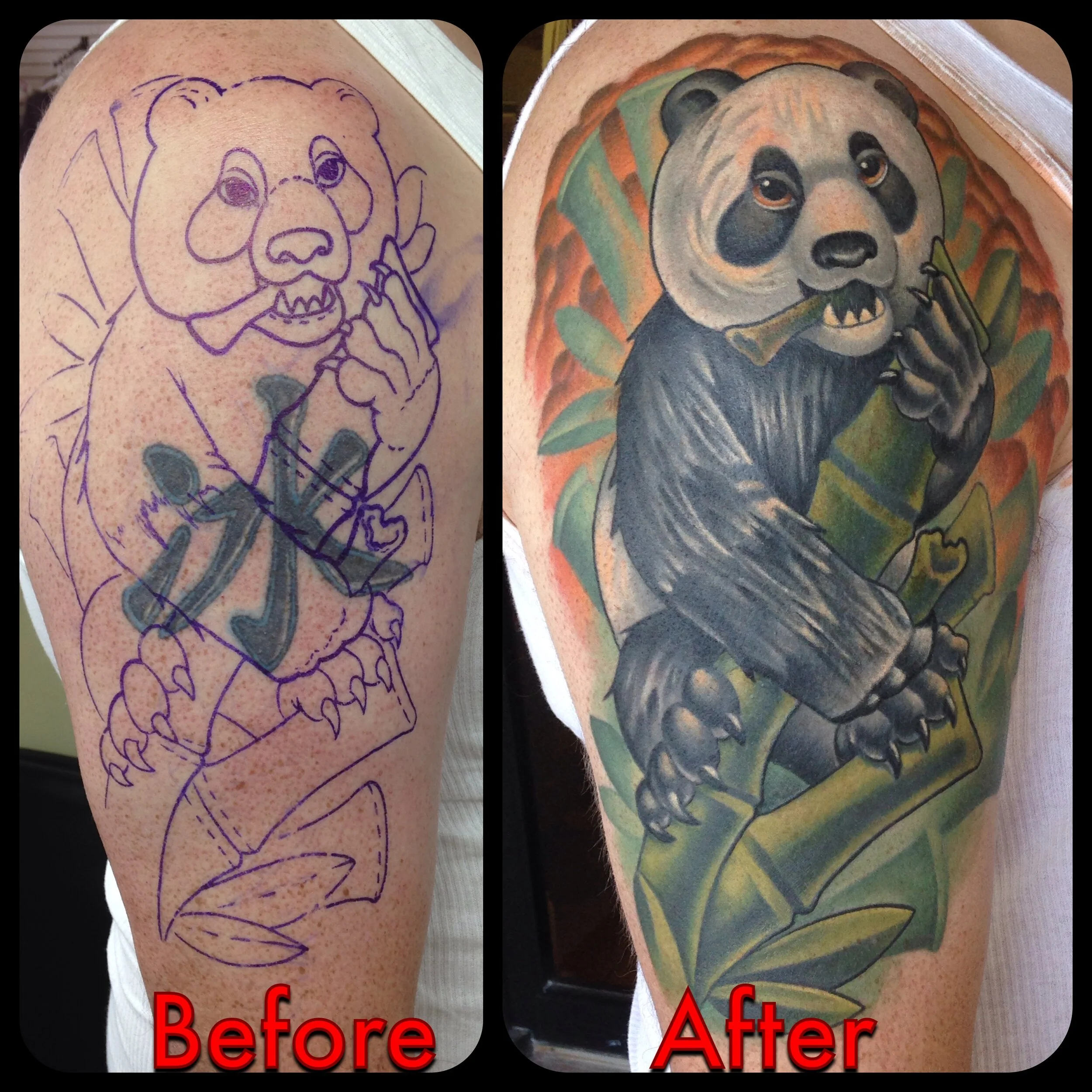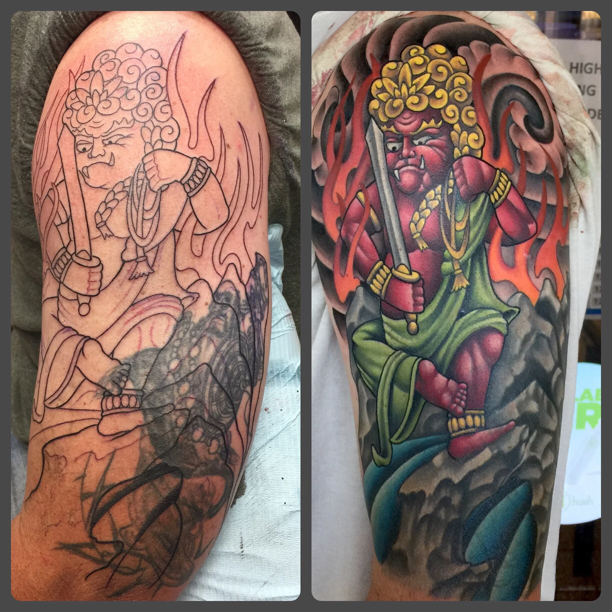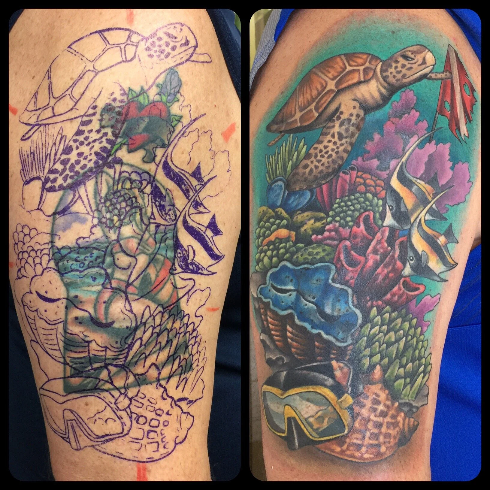 It is recommended to do your cover up about 3 times the size of your current tattoo. It’s very rare you can do a cover up the same size as what you are trying to have covered up. Think of it as not just covering, but creating more imagery to take your eye away from and camouflage the area we are covering.
