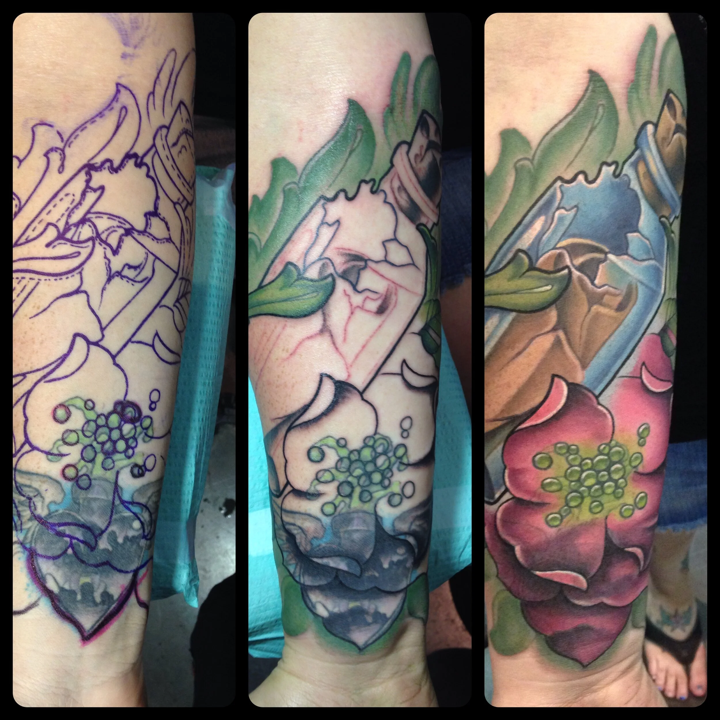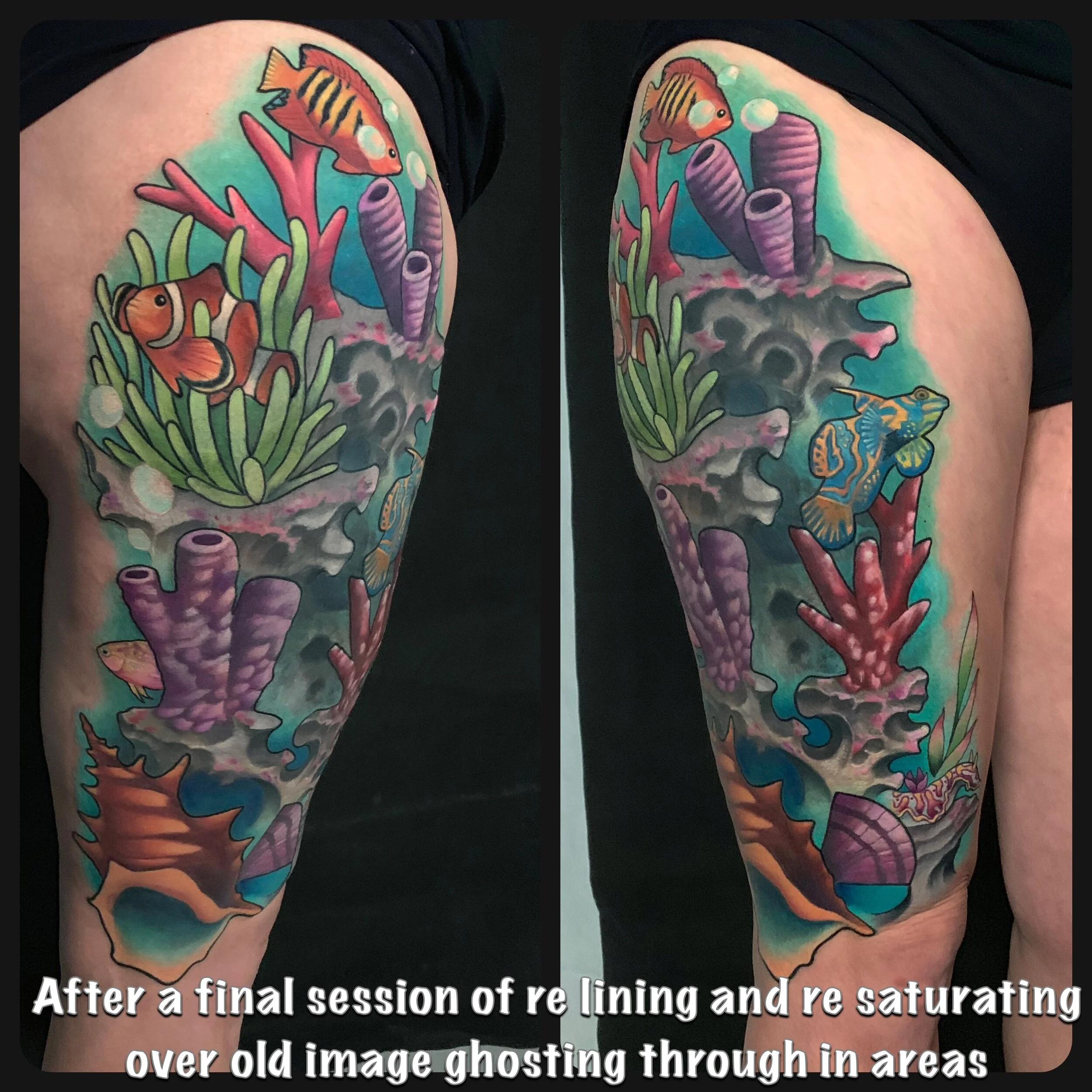 As such, cover ups are also a lifetime commitment, meaning that your tattoo will need touch ups sooner/more frequently than a tattoo that has be done on “clean” skin. Black is carbon based and interacts differently with skin and thus lasts far longer than color pigment, so, most of the time, as your skin heals over the tattoo, some color will lighten and black from the original tattoo will most likely start to show through again. To help maintain the quality of your new tattoo, the color will need to be touched up later down the road.*