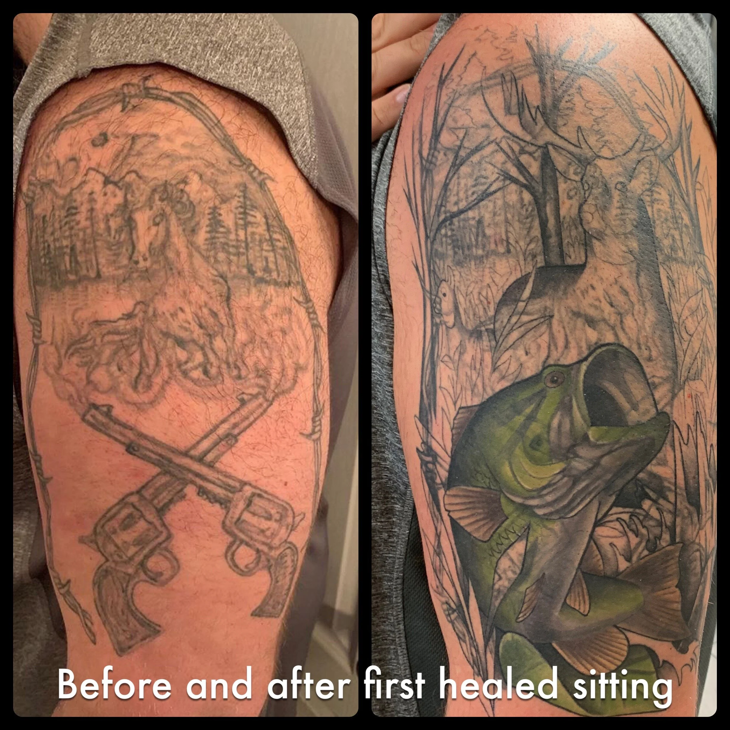 Not all coverups are created equal. Some tattoos are covered more easily than others. Sometimes it happens in one sitting, but most of the time, cover up tattoos need 2 to 3 sittings to add extra layers of color for best results.